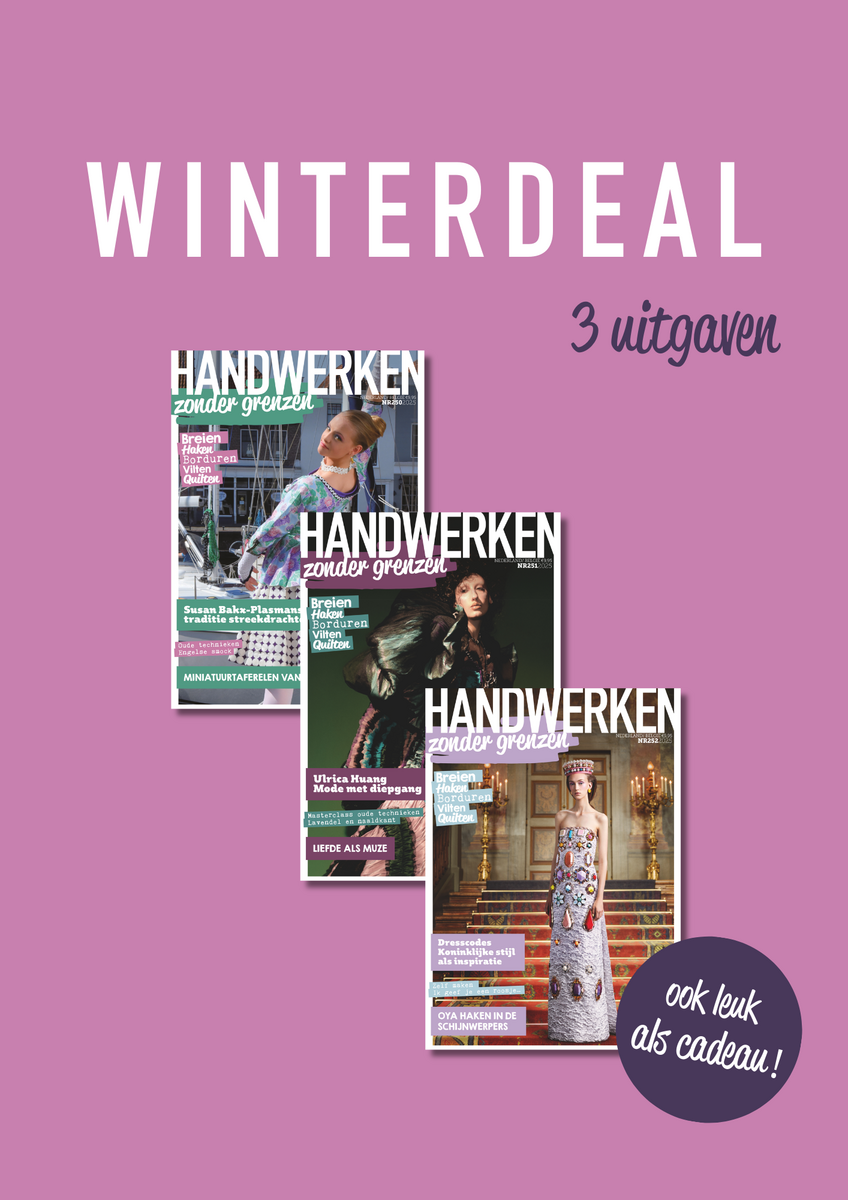 Met onze Winterdeal haal je het beste van Handwerken Zonder Grenzen in huis. Ontvang drie recente edities (nr. 250 t/m 252) boordevol inspiratie, patronen en bijzondere verhalen uit binnen- en buitenland. Perfect voor lange winteravonden, nieuwe projecten of om cadeau te geven.